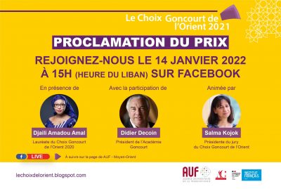 Pour sa dixième édition, l’AUF au Moyen-Orient organise le 14 janvier 2022 la proclamation du prix du Choix Goncourt de l’Orient, dans son Centre d’Employabilité Francophone (CEF), sous le parrainage de l’Académie Goncourt, et accueille à cette occasion Djaili Amadou Amal, lauréate de l’édition précédente du Choix Goncourt de l’Orient. Didier Decoin, président de l’Académie Goncourt, interviendra en ligne pour marquer le dixième anniversaire de ce prix.