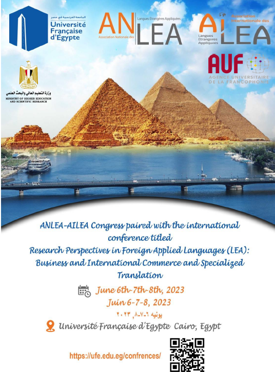Le Département des Langues Étrangères Appliquées de l’Université Française d’Égypte (UFE) organise le colloque international « Perspectives de la recherche en Langues Étrangères Appliquées (LEA) : Affaires et commerce international et traduction spécialisée » en marge du congrès ANLEA-AILEA, du 6 au 8 juin 2023 au Caire. L'AUF est partenaire de cet événement international qui se tient sous le haut patronage du ministère de l’Enseignement supérieur et de la recherche scientifique en Égypte.