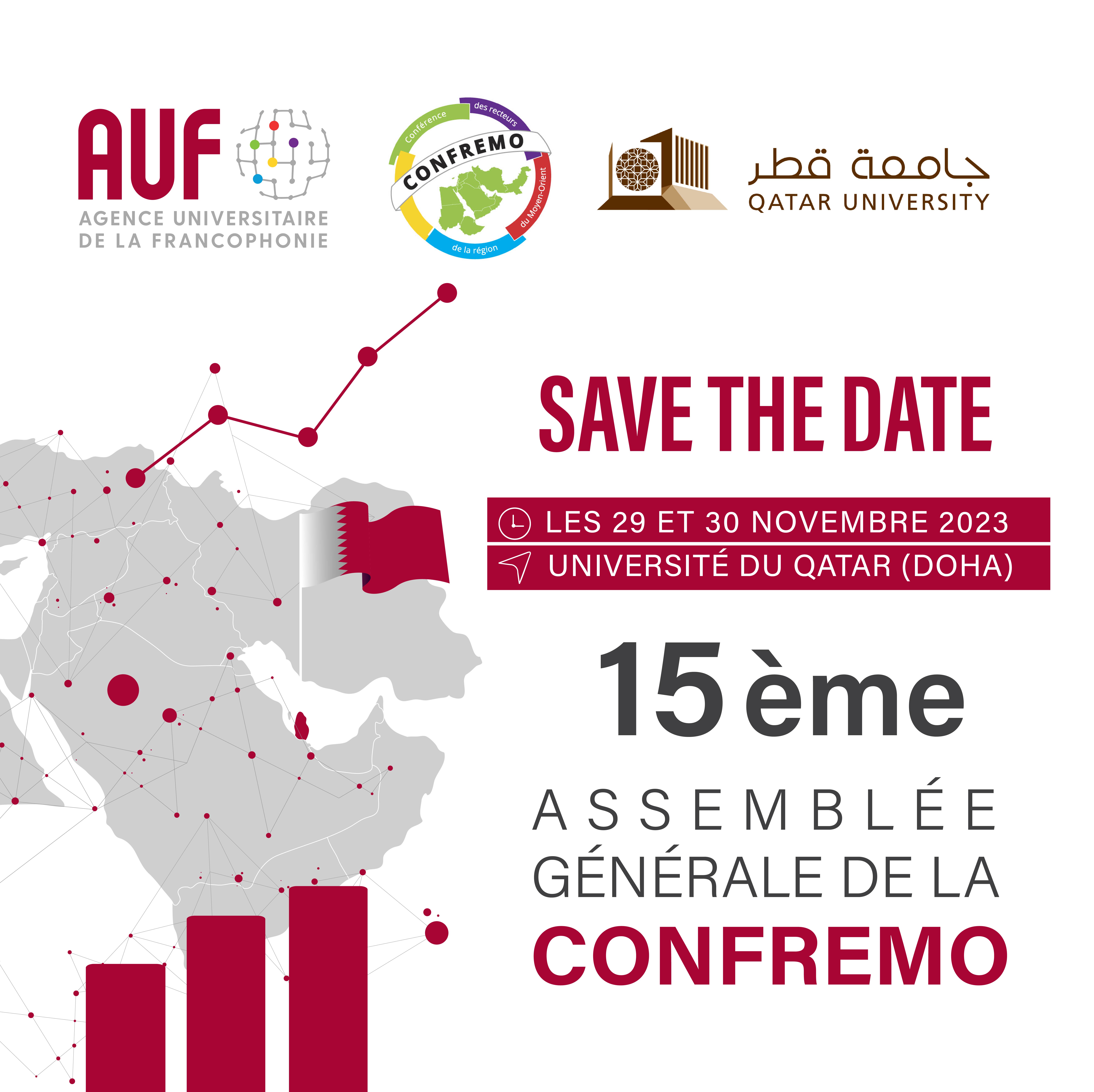 La Conférence des Recteurs de la Région du Moyen-Orient (CONFREMO) et l'Agence universitaire de la Francophonie annoncent que la 15ème Assemblée générale de la CONFREMO se tiendra cette année à l’Université du Qatar, à Doha, les 29 et 30 novembre 2023.