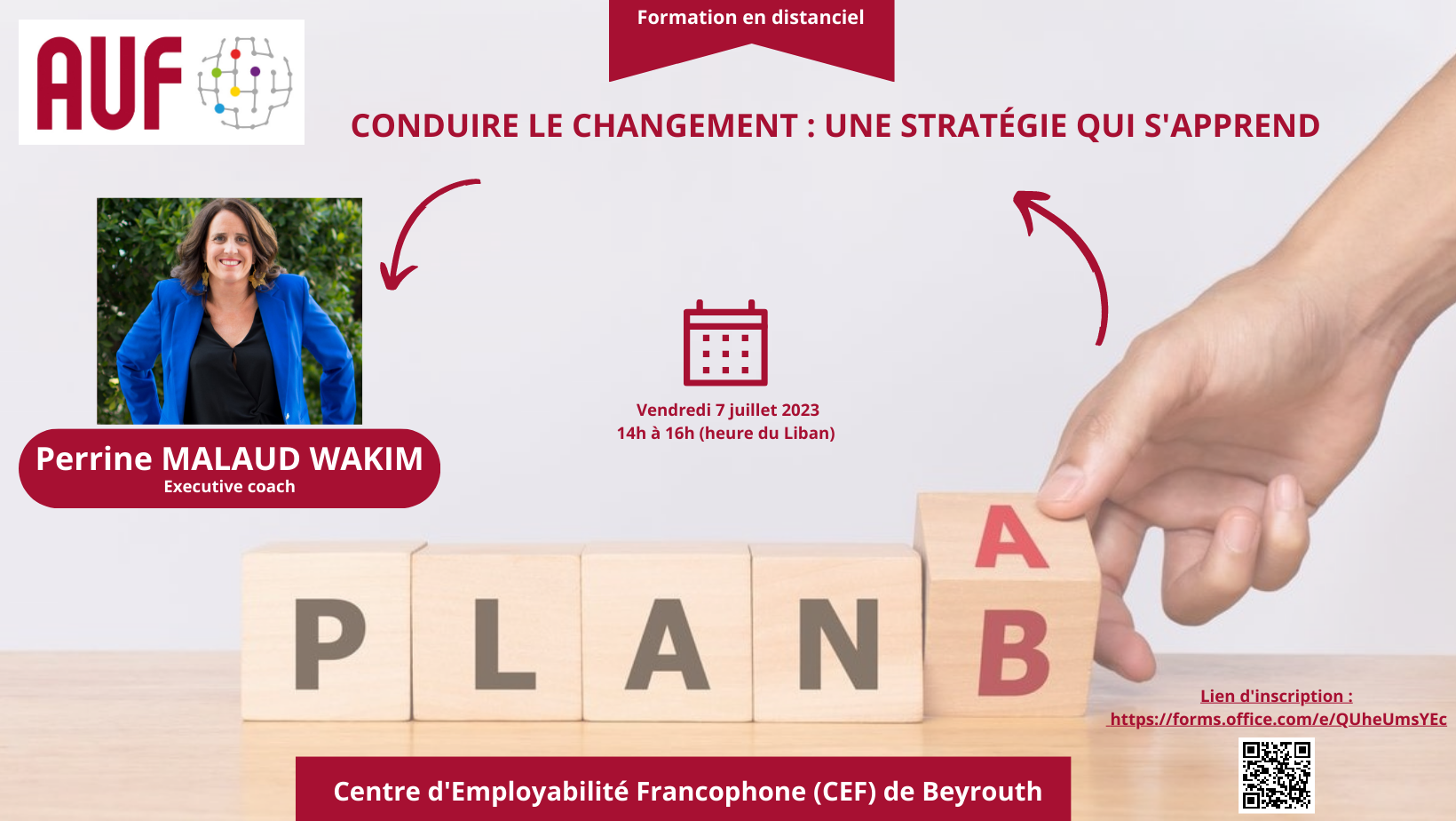 Le Centre d’Employabilité Francophone (CEF) de Beyrouth de l’AUF organise une formation intitulée « Conduire le changement : une stratégie qui s’apprend », le 7 juillet 2023, de 14h00 à 16h00, en distanciel.