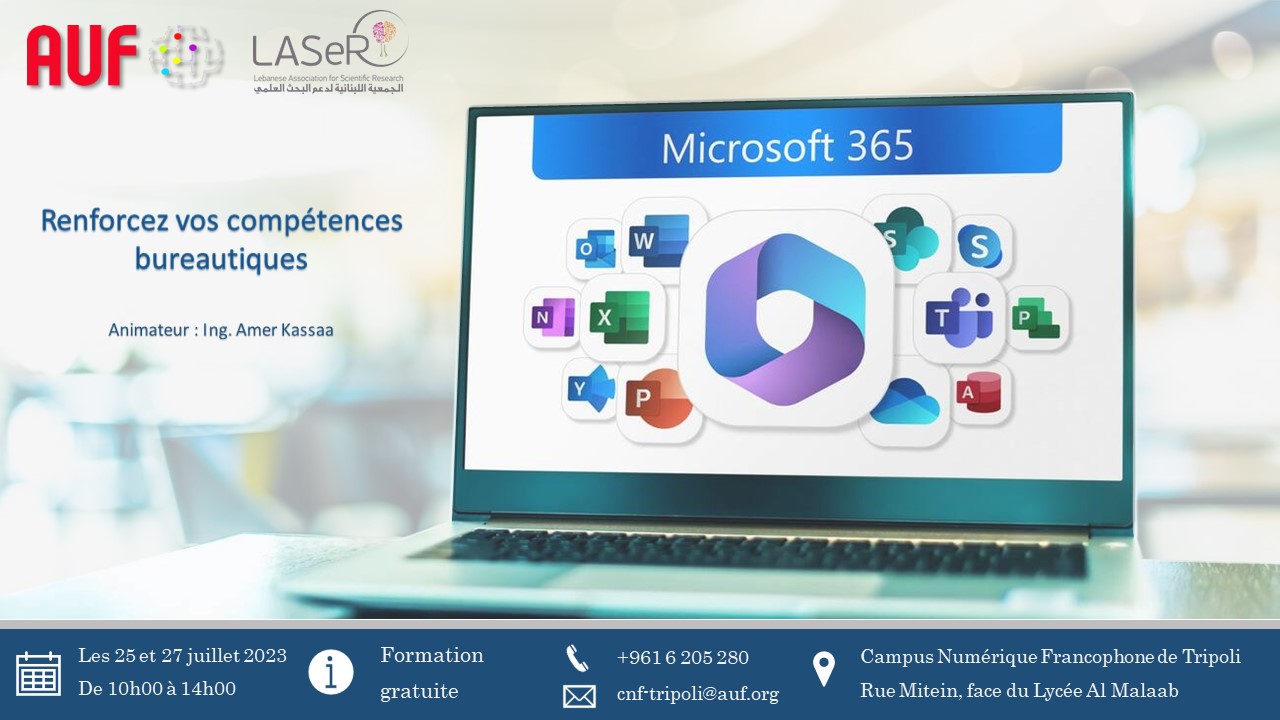 Le Campus Numérique Francophone de Tripoli organise, en collaboration avec l’association LASeR, une formation intitulée « Renforcez vos compétences bureautiques ».