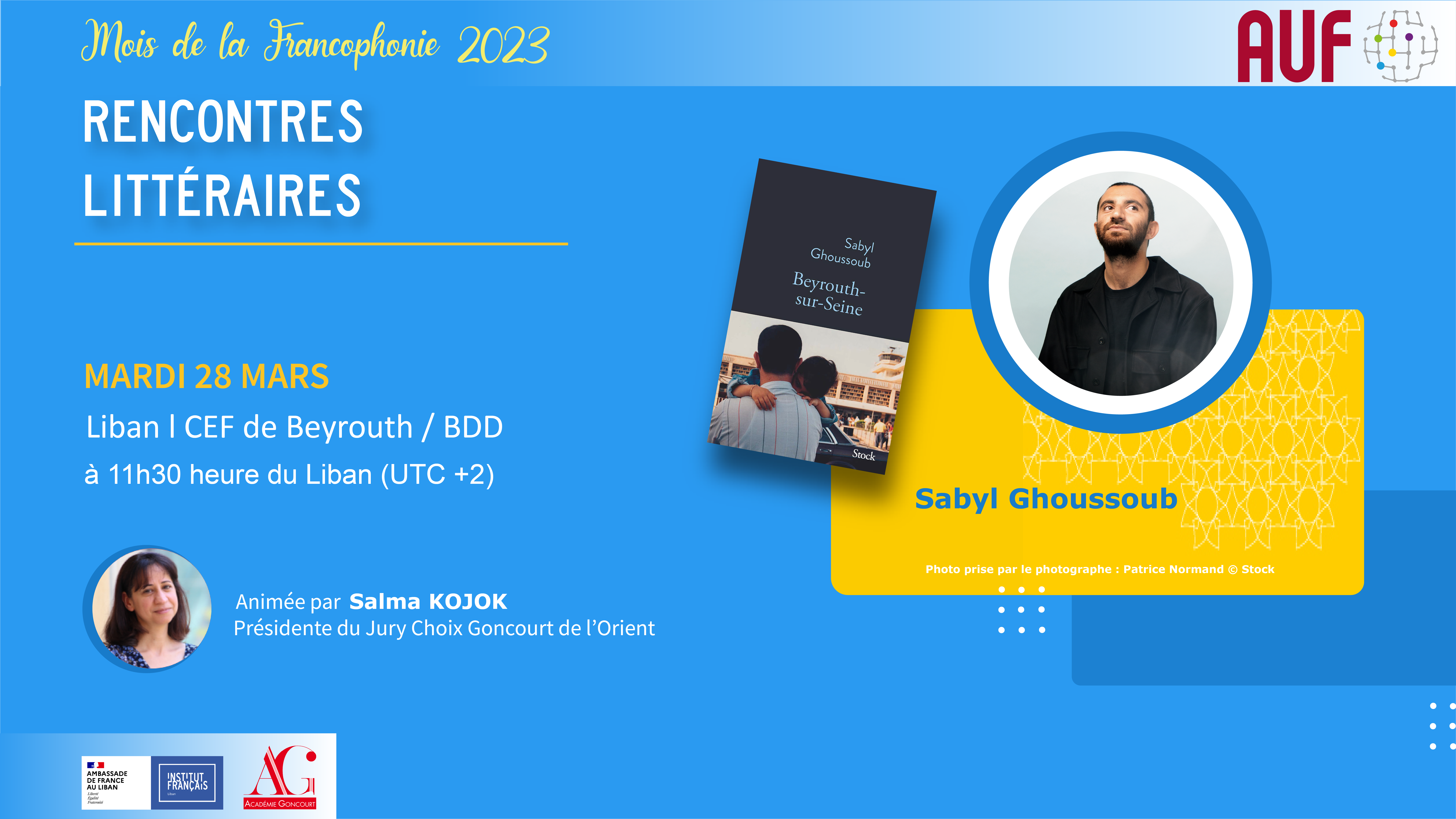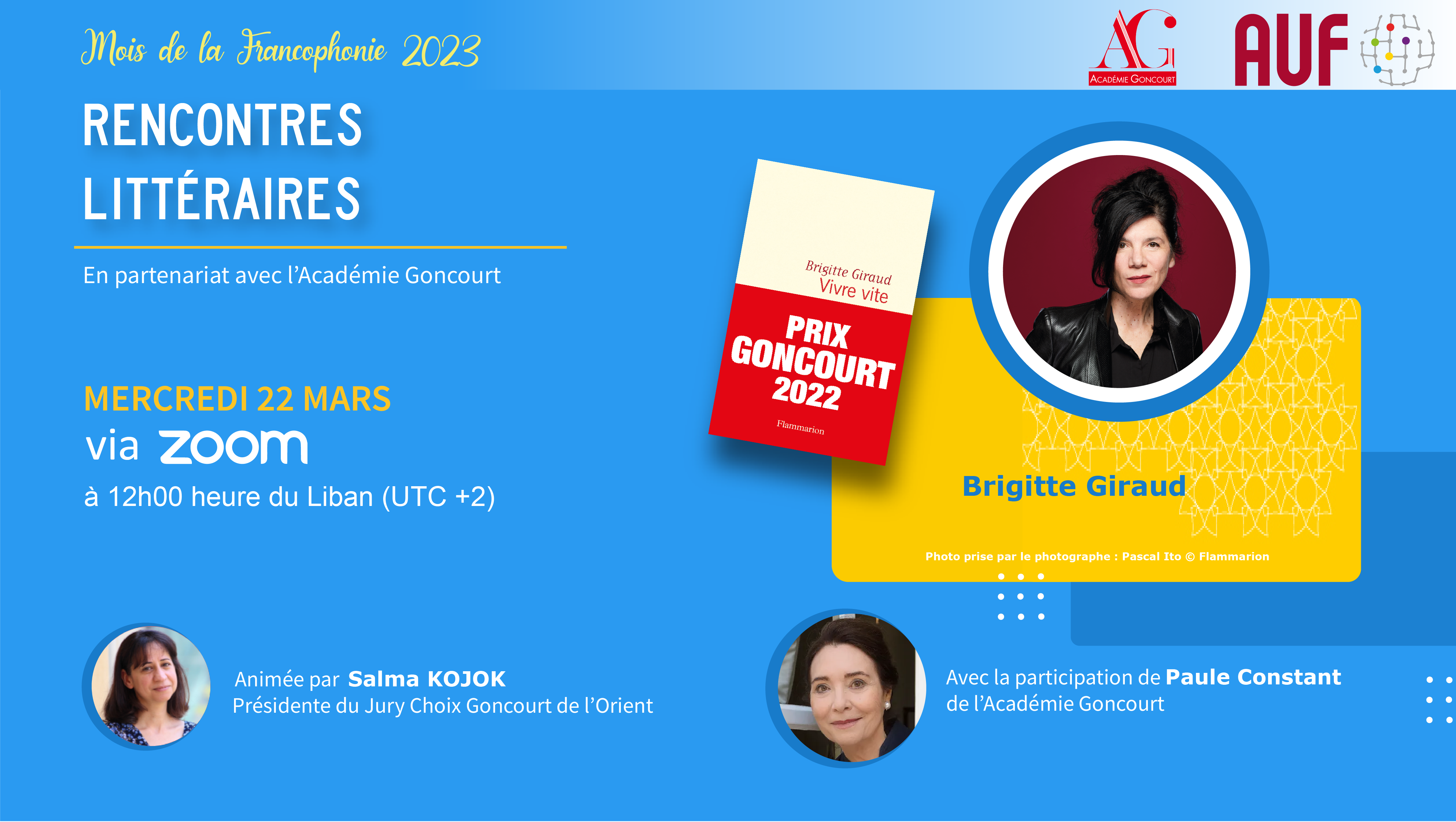 Dans le cadre du Mois de la Francophonie 2023, l’Agence Universitaire de la Francophonie (AUF) Moyen-Orient, en partenariat avec l’Académie Goncourt, organise une rencontre littéraire exceptionnelle avec Brigitte Giraud, lauréate du prix Goncourt 2022, pour son roman « Vivre vite » paru chez « Flammarion ». L’événement se tiendra en ligne, le mercredi 22 mars à 12h00 heure du Liban (UTC+2), avec la participation de Paule Constant de l'Académie Goncourt, et sera animé par Salma Kojok, écrivaine et présidente du Jury du Choix Goncourt de l’Orient.