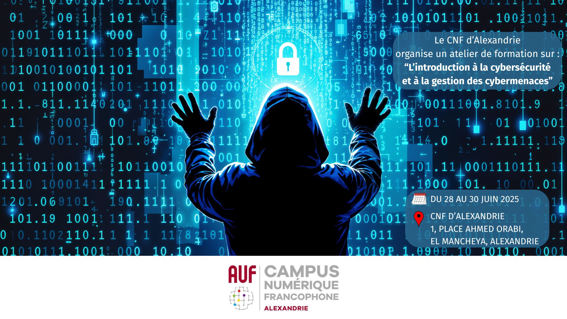 Le Campus Numérique Francophone d'Alexandrie (CNF) de l'AUF organise un atelier de formation intitulé « Introduction à la cybersécurité et à la gestion des cybermenaces », du 28 au 30 juin 2025, en présentiel, avec une série complète de modules de formation d’une durée totale de 22 heures.