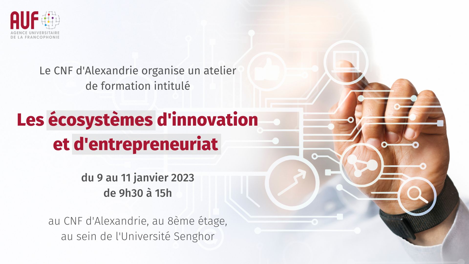 Le Campus Numérique Francophone d'Alexandrie de l’AUF organise un atelier de formation intitulé « Les écosystèmes d’innovation et d’entrepreneuriat », du 9 au 11 janvier 2023.