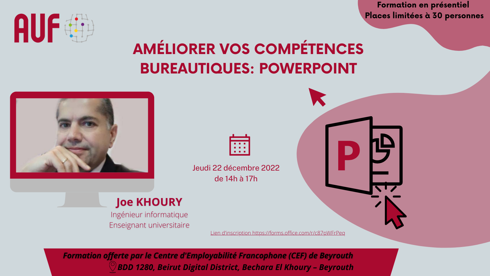 Le Centre d’Employabilité Francophone (CEF) de Beyrouth de l’AUF, organise une formation intitulée « Améliorer vos compétences bureautiques : PowerPoint », le 22 décembre 2022, de 14h00 à 17h00, en présentiel au CEF de Beyrouth, BDD 1280.