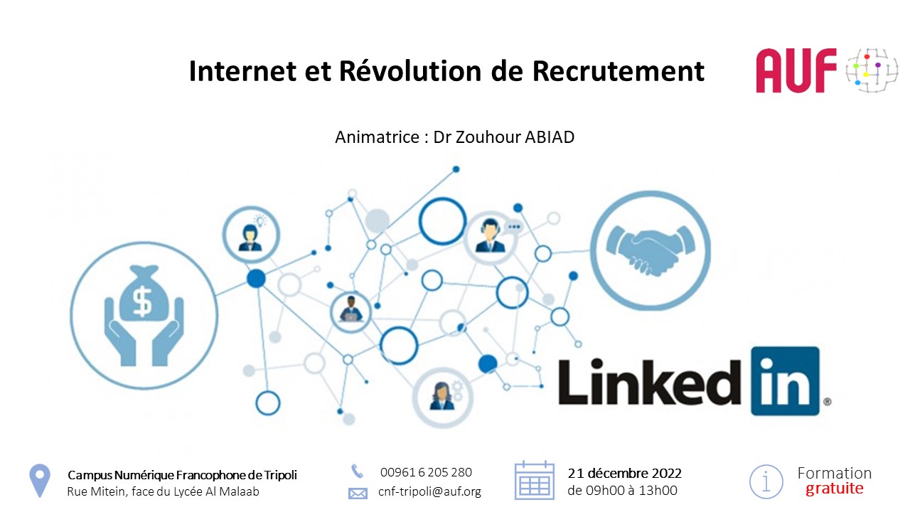 Le Campus Numérique Francophone de Tripoli de l'AUF organise une formation intitulée « Internet et révolution de recrutement » qui vise à acquérir les techniques et méthodes nécessaires pour être efficace et autonome lors d’une recherche d'emploi (TRE), et à se présenter correctement sur les réseaux sociaux (agir et gérer les informations) afin de capter l’attention des recruteurs potentiels.
