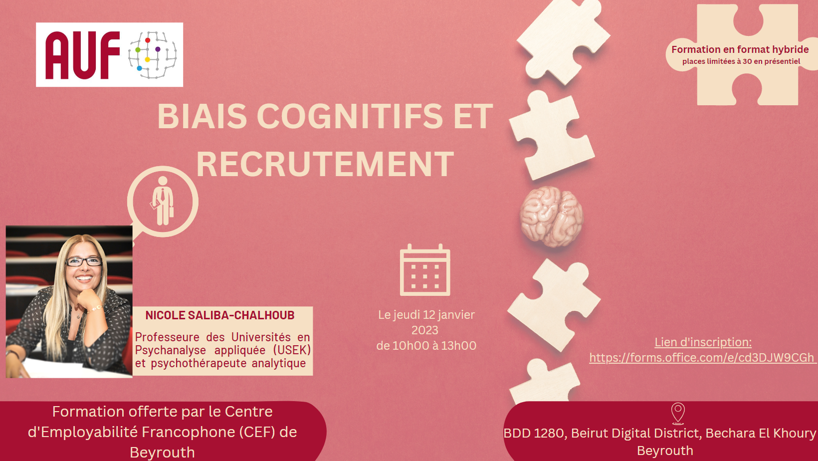 Le Centre d’Employabilité Francophone (CEF) de Beyrouth de l’AUF Moyen-Orient organise une formation intitulée « Biais cognitifs et recrutement », le 12 janvier 2023 de 10h00 à 13h00, en format hybride.