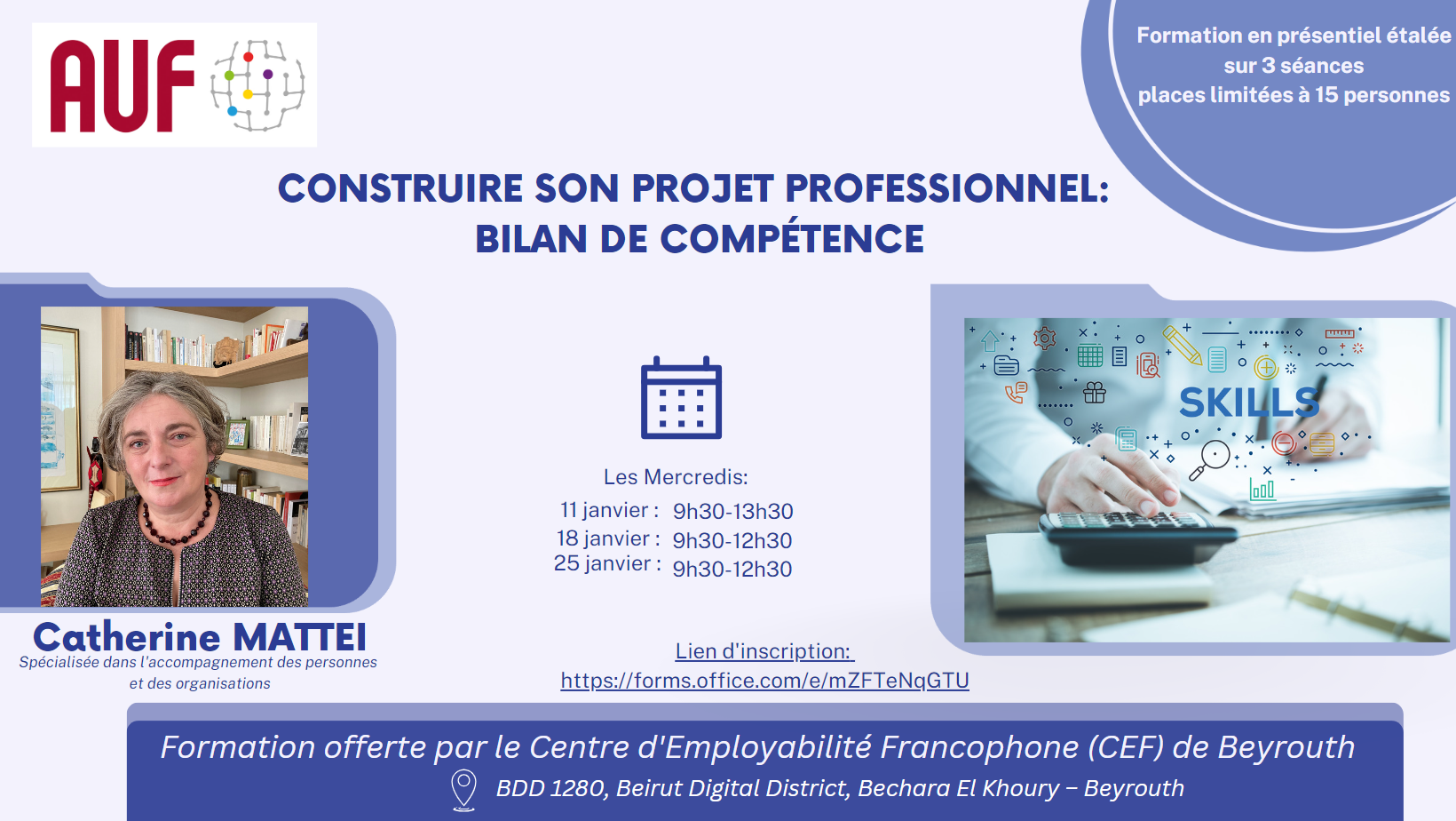 Le Centre d’Employabilité Francophone (CEF) de Beyrouth de l’AUF organise trois ateliers de formation intitulés « Construire son projet professionnel : bilan de compétence », les 11, 18 et 25 janvier 2023, de 9h30 à 13h30.