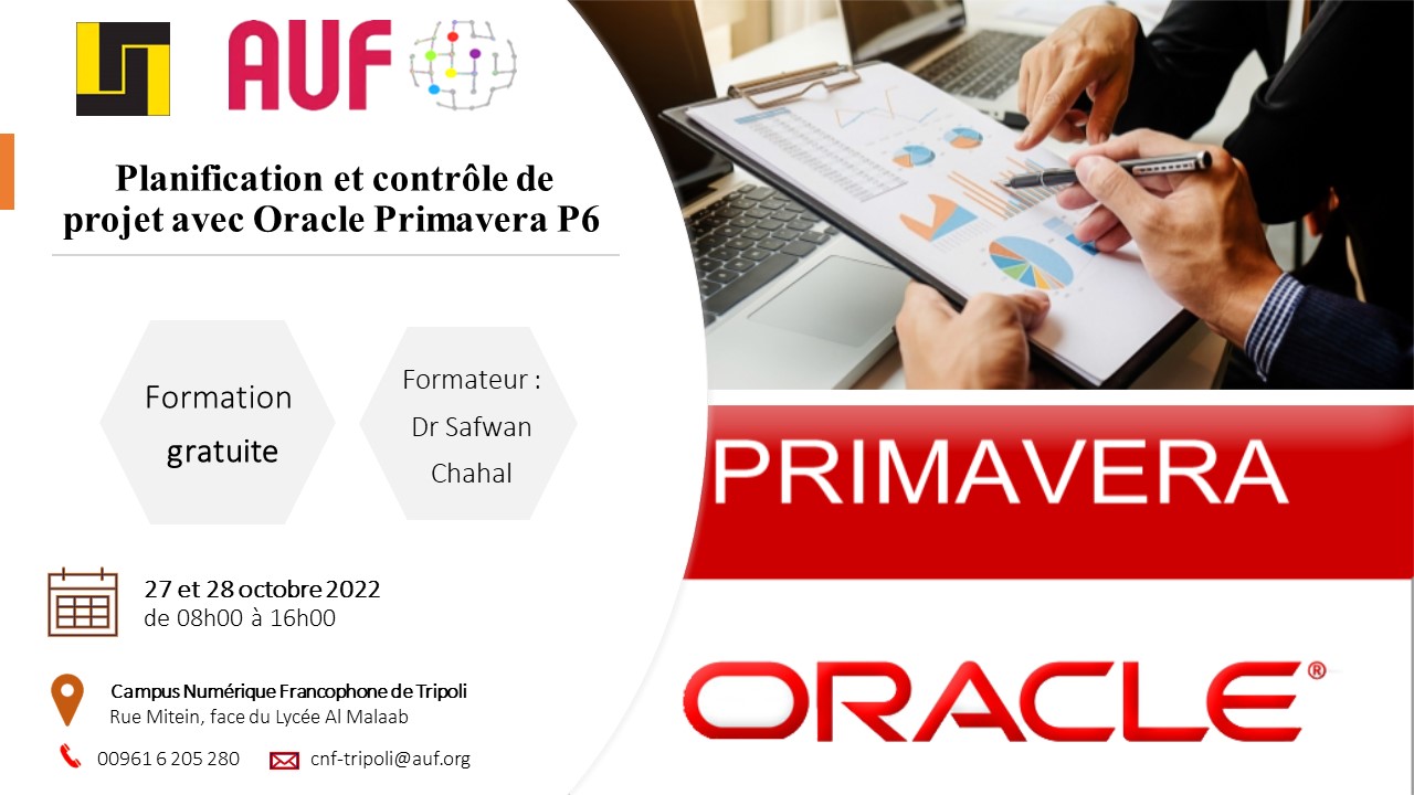 Dans le cadre de l'accord de coopération signé entre l'Agence Universitaire de la Francophonie et l'Ordre des Ingénieurs et Architectes de Tripoli et du Liban Nord, le Campus Numérique Francophone de Tripoli de l'AUF organise, en collaboration avec l'Ordre des ingénieurs de Tripoli et du Liban Nord, une formation intitulée « Planification et contrôle de projet avec Oracle Primavera P6 ».