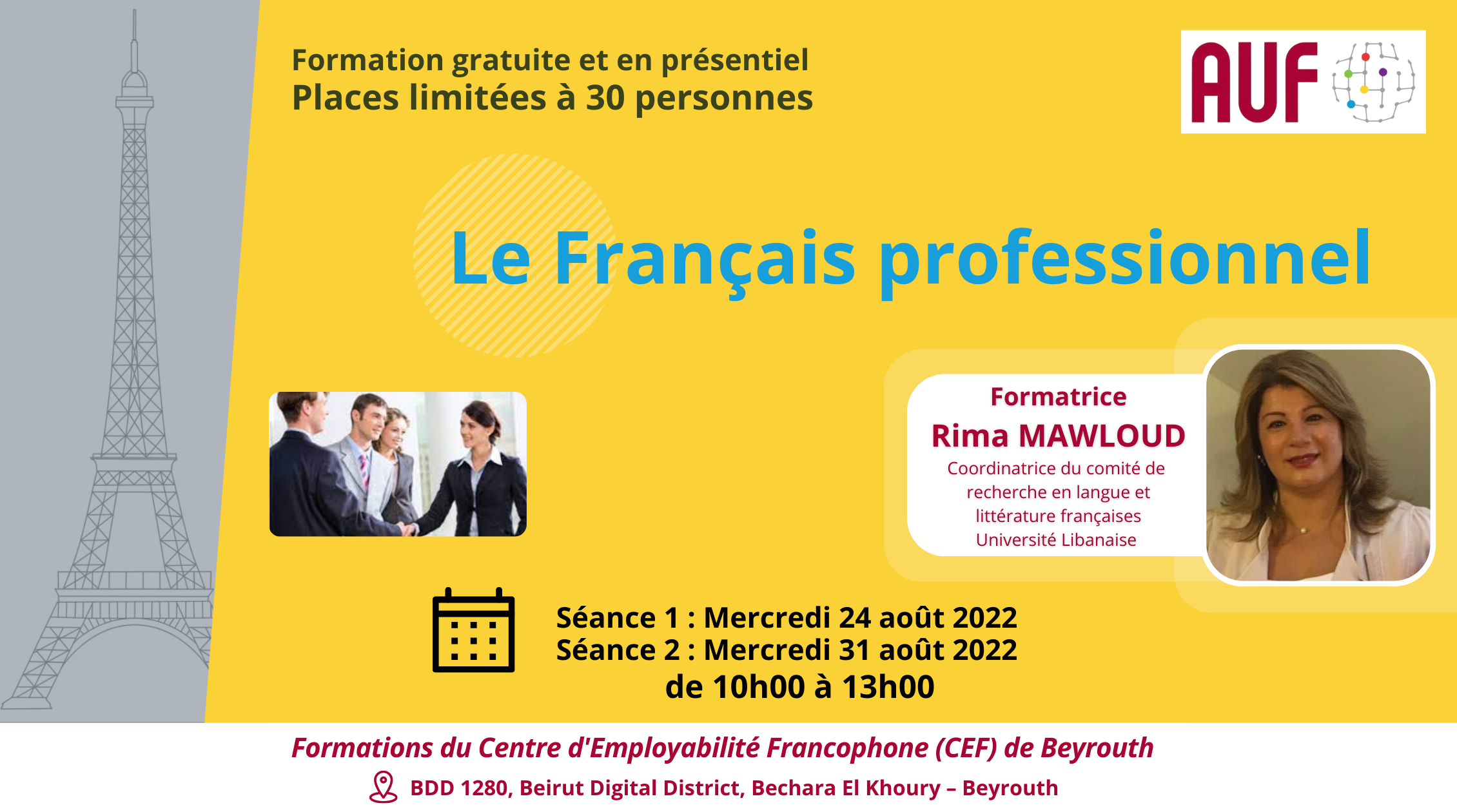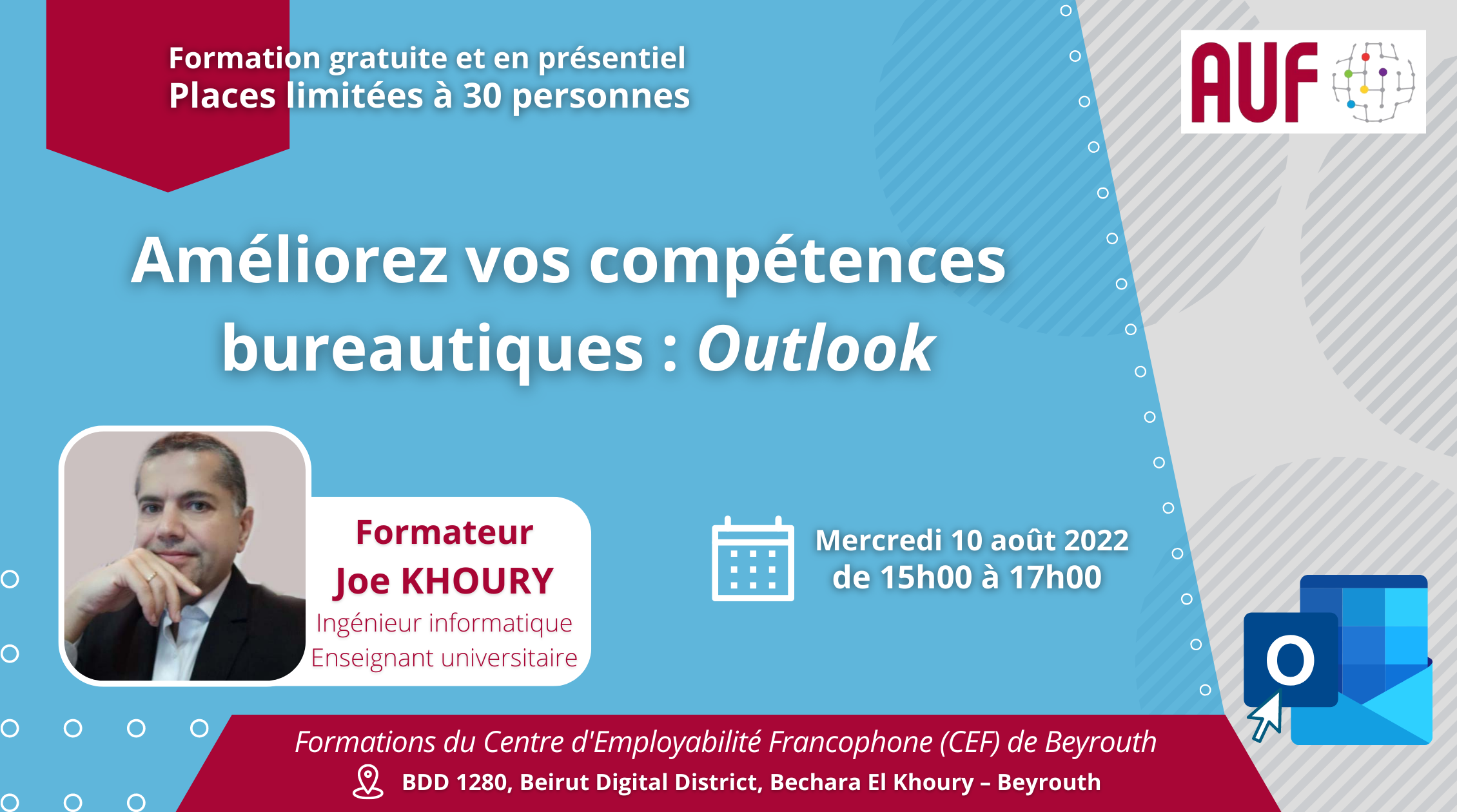 Le Centre d’Employabilité Francophone de Beyrouth (CEF) de l’AUF, organise une formation intitulée « Améliorer vos compétences bureautiques : Outlook », le 10 août 2022, de 15h00 à 17h00, en présentiel, au CEF de Beyrouth, BDD 1280, Beirut Digital District, Bechara El Khoury – Beyrouth.