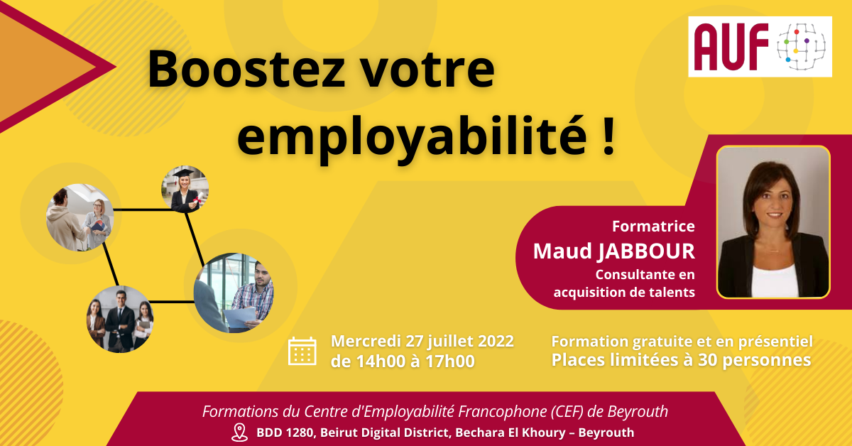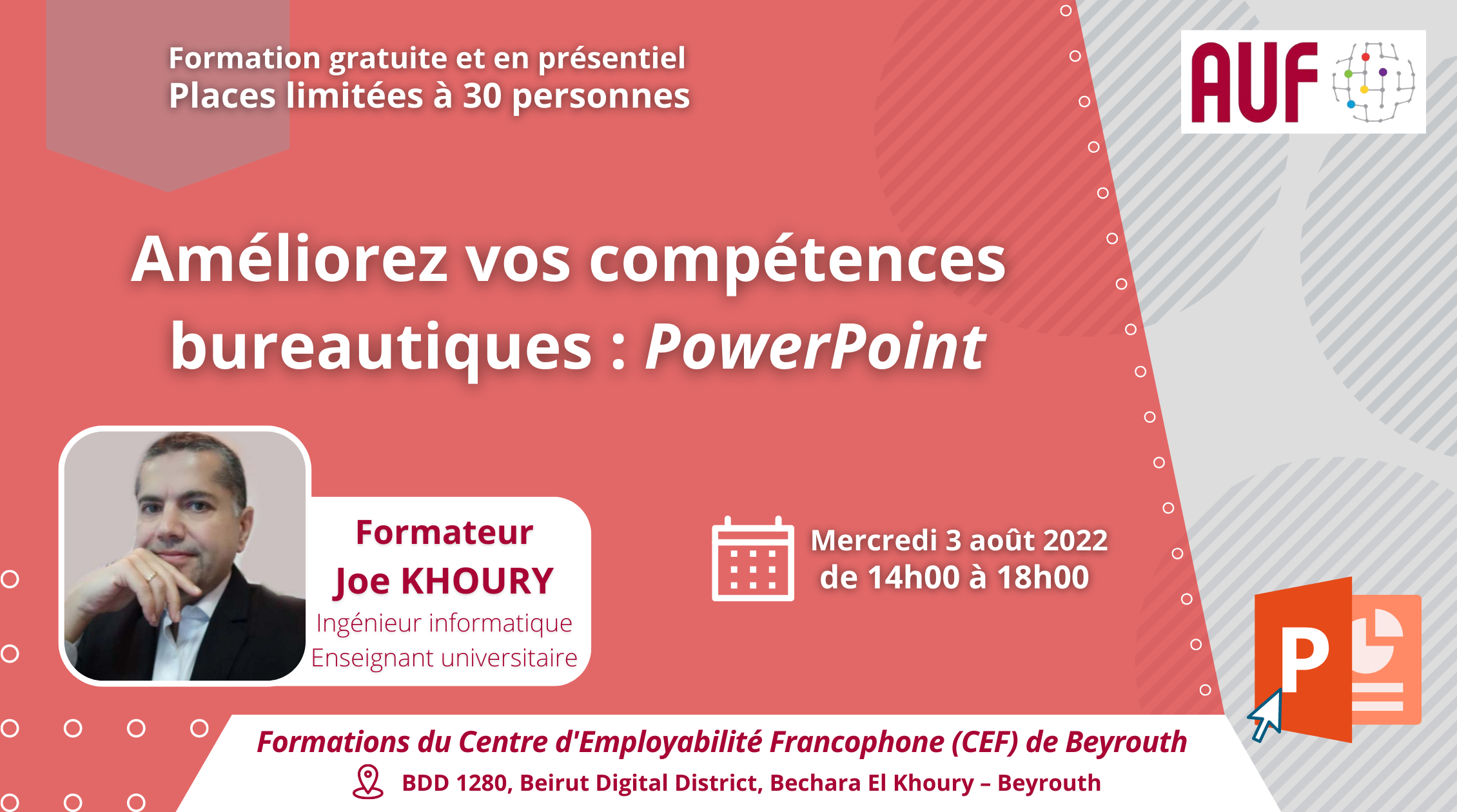 Le Centre d’Employabilité Francophone de Beyrouth (CEF) de l’AUF, organise une formation intitulée « Améliorer vos compétences bureautiques : PowerPoint », le 3 août 2022, de 14h00 à 18h00, en présentiel, au CEF de Beyrouth, BDD 1280, Beirut Digital District, Bechara El Khoury – Beyrouth.