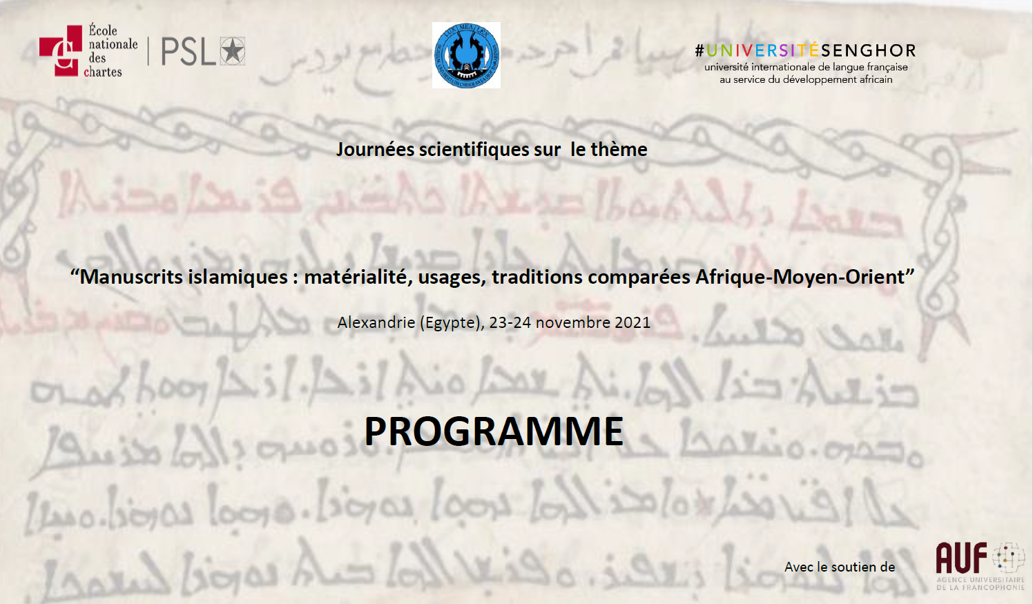 L’Université Senghor d’Alexandrie organise le séminaire « Manuscrits islamiques : matérialité, usages, traditions comparées Afrique-Moyen-Orient », dans le cadre du consortium Senghor-École des chartes-École des bibliothécaires, archivistes, documentalistes, les 23 et 24 novembre 2021. L'AUF est partenaire de ce séminaire.