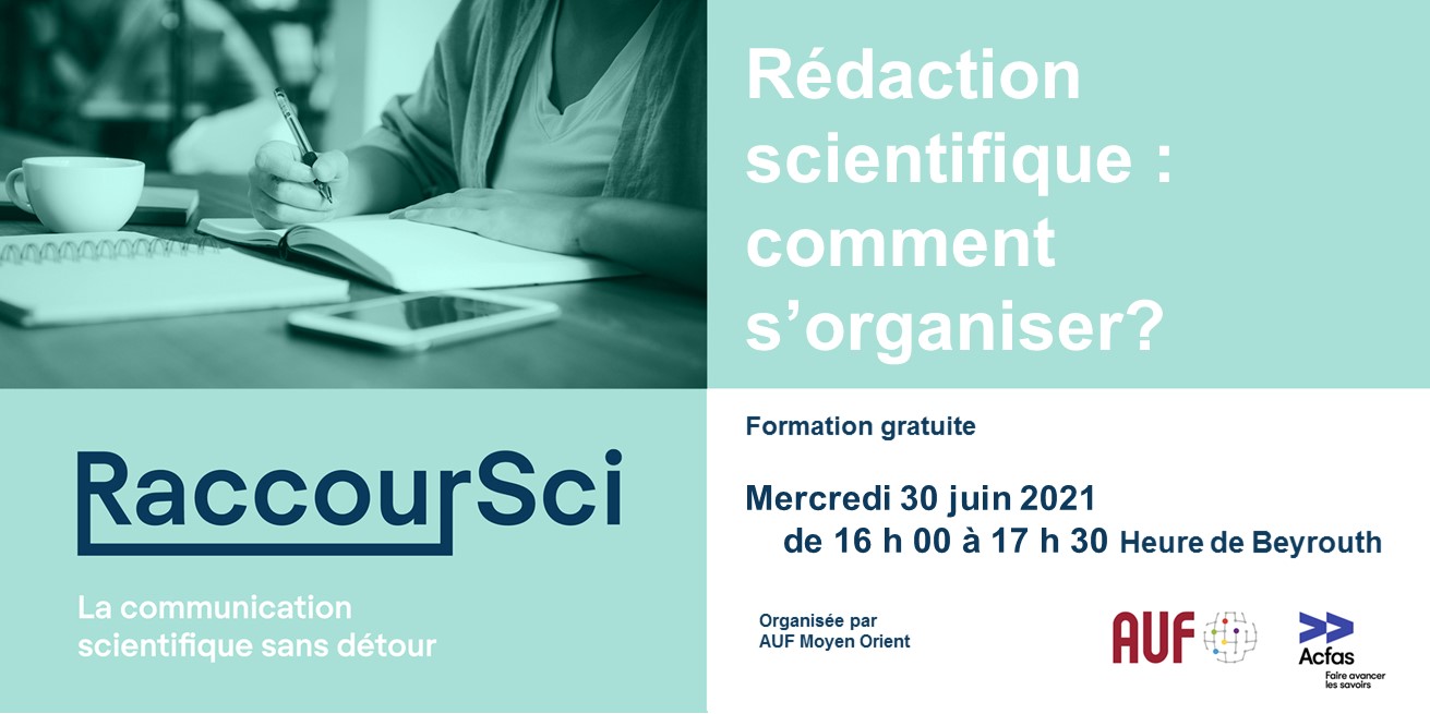 L’AUF au Moyen-Orient propose un temps de formation en lien avec le contenu du portail RaccourSci. Cette formation porte sur le thème de la « rédaction scientifique ». Il s’agit de partager des conseils et astuces pour la rédaction, par exemple d’un article scientifique, ou de sa thèse : quelle stratégie mettre en place pour gérer son temps, comment alterner des moments de planification, de rédaction et de pause, comment s’organiser, contrer la procrastination, briser l’isolement et adopter des habitudes de travail équilibrées.