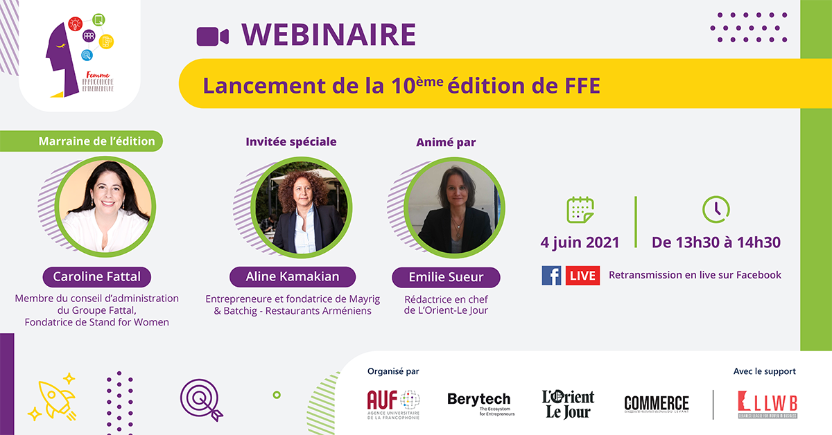 A l’occasion du 10ème anniversaire du Prix Femme Francophone Entrepreneure, l’AUF, Berytech, L’Orient-Le Jour et Le Commerce du Levant organisent un webinaire consacré au lancement de l’édition 2021, le vendredi 4 juin de 13h30 à 14h30, en direct depuis le Campus connecté de Beyrouth.