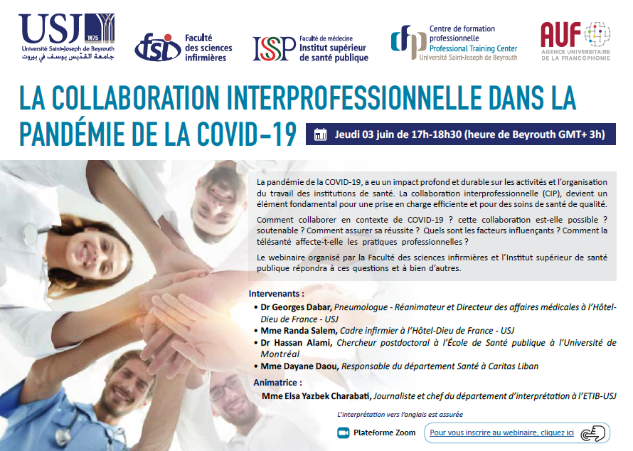 La Faculté des sciences infirmières et l’Institut Supérieur de santé publique de l’USJ, organise, avec le soutien de l'AUF, son second webinaire sur : « la collaboration interprofessionnelle dans la pandémie de COVID-19 », le jeudi 3 juin de 17h à18h30, via la plateforme Zoom.
