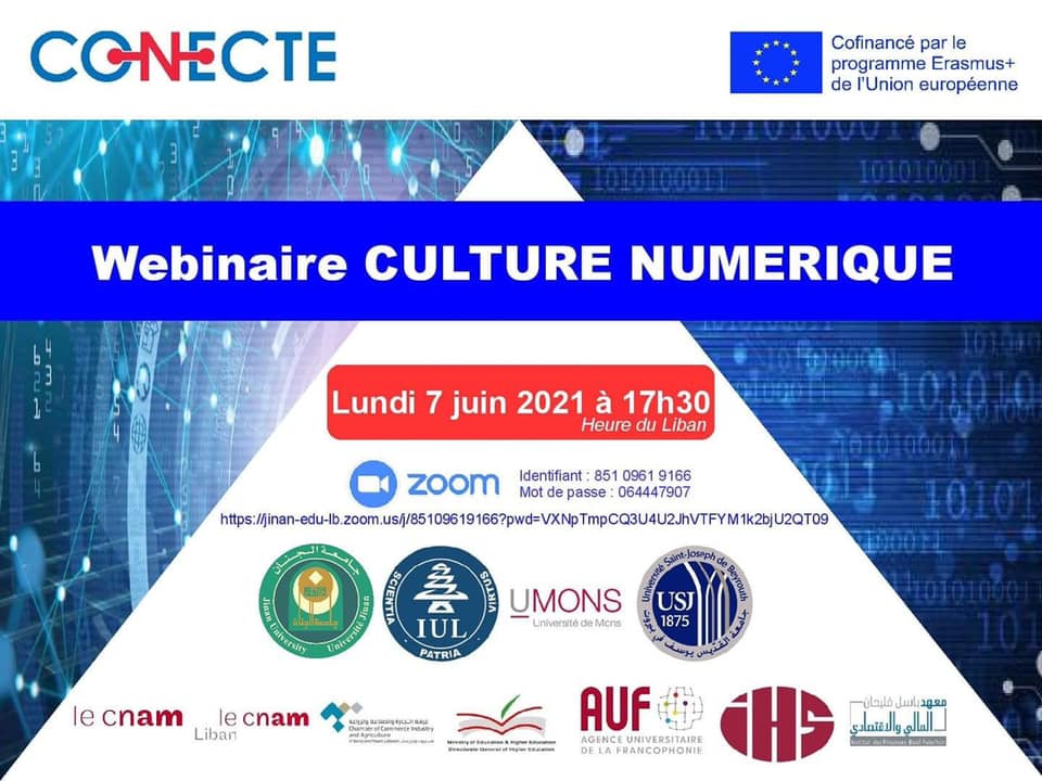 Le projet CONECTE (projet Erasmus+ cofinancé par l’Union Européenne) organise un webinaire public sur la culture numérique, le 7 juin 2021, à 17h30 (heure de Beyrouth).