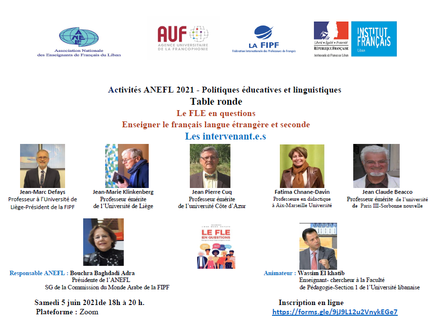 L’Association Nationale des Enseignants de Français du Liban (ANEFL) organise, en partenariat avec l'AUF, l’IFL et la FIPF, un webinaire autour de l’ouvrage « Le FLE en questions - enseigner le français langue étrangère et seconde » qui accueillera les auteurs de l’ouvrage, experts en FLE : Jean-Marc Defays, Jean-Marie Klinkenberg, Fatima Chnane-Davin, Jean-Claude Beacco, Jean-Pierre Cuq.