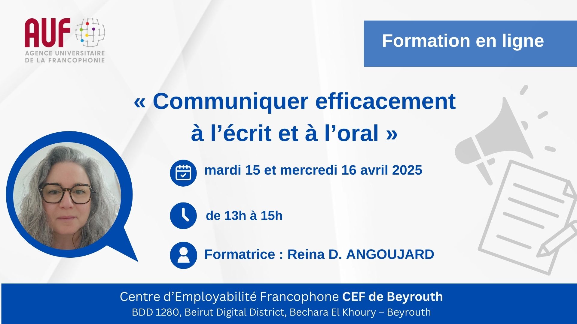 L’AUF Moyen-Orient organise une formation gratuite intitulée « Exploiter le potentiel de l’IA à l’université : vers une pratique éthique et efficace », qui vise les enseignants chercheurs et les étudiants, dans le cadre des activités du Centre d'Employabilité Francophone (CEF) de Beyrouth. La formation aura lieu jeudi 15 mai 2025, de 14h00 à 16h00, au CEF de Beyrouth, et sera animée par Aïda Soufi.