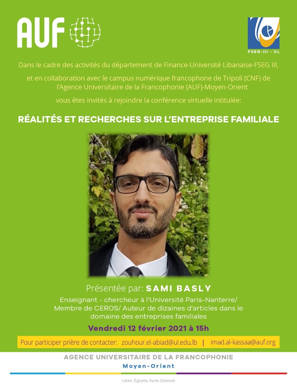 Le Campus Numérique Francophone de Tripoli de l'AUF organise une conférence en ligne, en collaboration avec la faculté de Gestion de l’Université Libanaise, intitulée « Réalités et recherches sur l’entreprise familiale », animée par Dr. Sami BASLY, qui aura lieu le vendredi 12 février 2021, à 15h, via Zoom.
