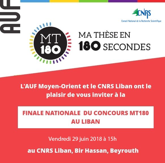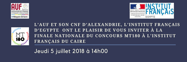 L’Agence universitaire de la Francophonie (AUF) est partenaire, pour la quatrième année consécutive, du concours de vulgarisation scientifique « Ma thèse en 180 secondes ». Cette année, l’AUF organise les finales nationales de MT180 secondes dans 14 pays dont l’Egypte qui y participe pour la première fois. La compétition se déroulera le jeudi 5 juillet 2018, à l’institut français d’Égypte, au Caire. Le vainqueur bénéficiera de la prise en charge de l'AUF pour représenter l’Égypte à la finale internationale, le 27 septembre 2018, à Lausanne en Suisse.