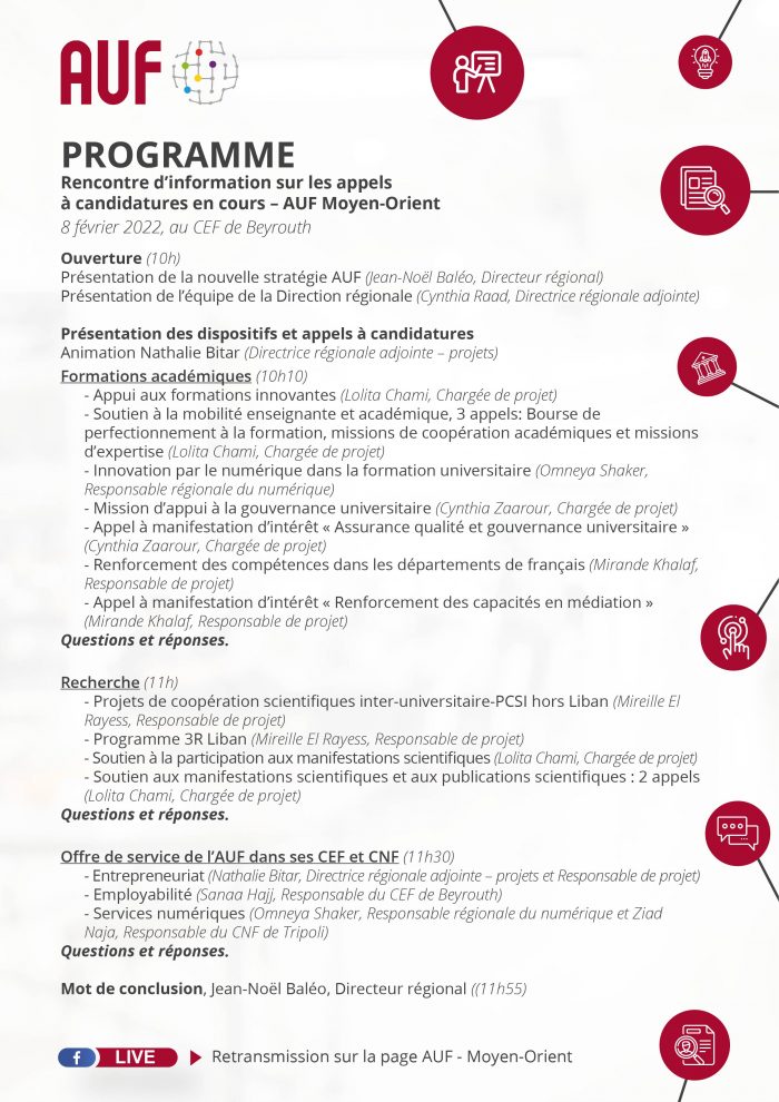 Face à un panel d’invités composé d’universitaires, professeurs et chercheurs, de représentants de nos principaux partenaires, notre équipe présentera l’AUF Moyen-Orient, ses implantations locales, ses pôles d’activités, ses projets, ses nombreux dispositifs de soutien aux universités membres.