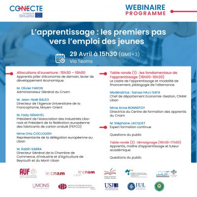 Les partenaires du projet CONECTE, dont l'Agence Universitaire de la Francophonie, organisent un webinaire sur le thème de la formation par alternance, le jeudi 29 avril, à 15h30 (GMT+3).