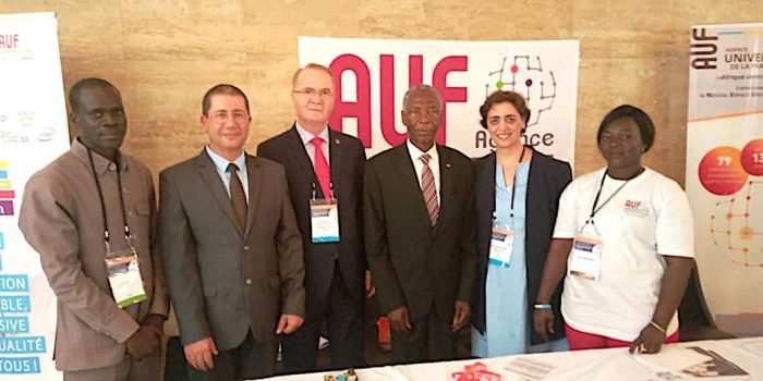 Ici, dans le stand de l’AUF, avec le Ministre de l’enseignement supérieur du Tchad (3ème à droite).