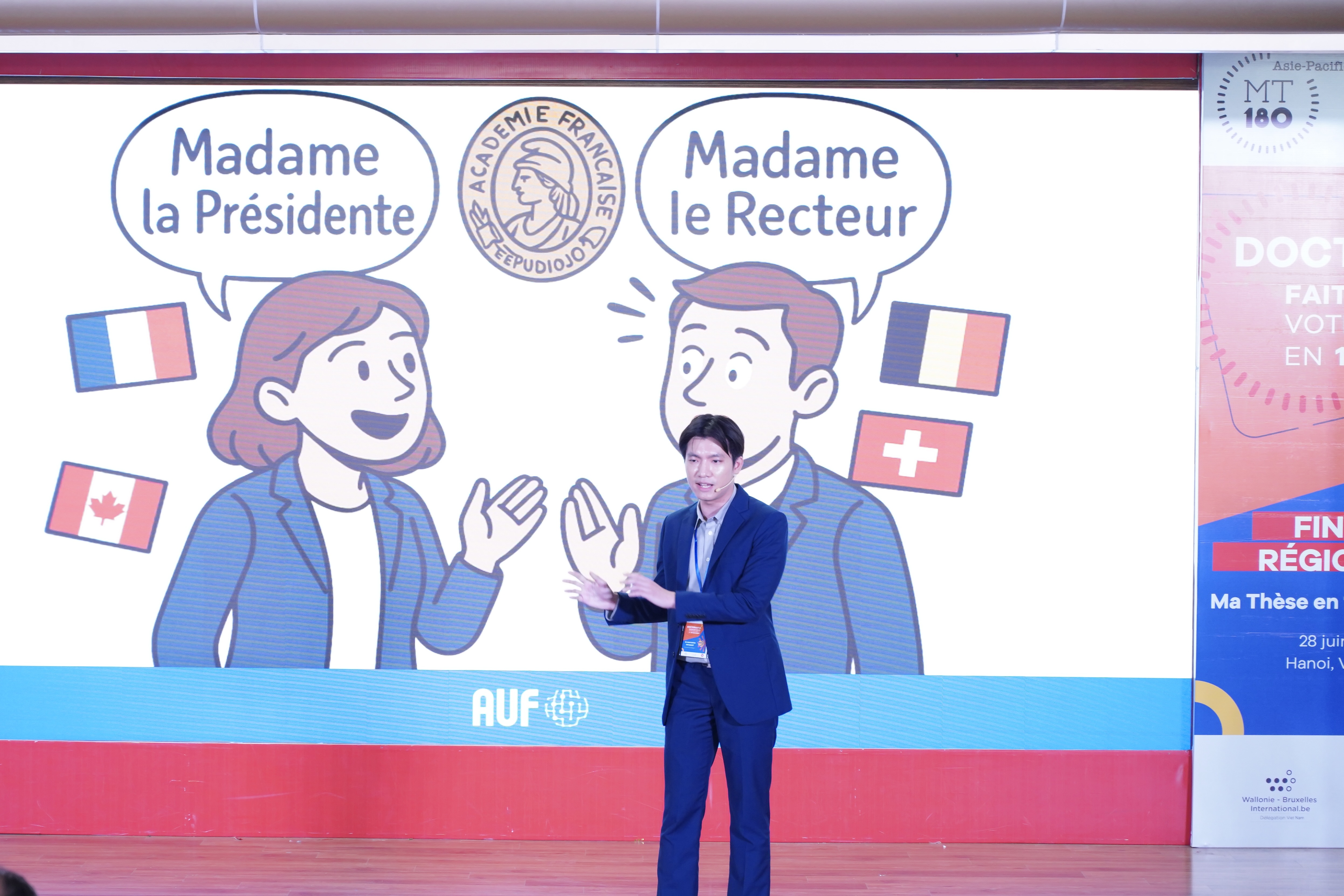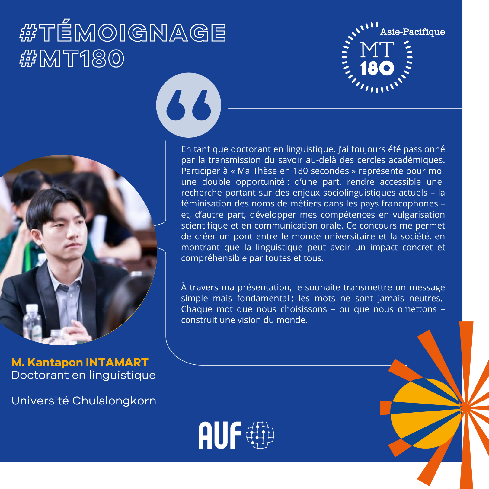 « En tant que doctorant en linguistique, j’ai toujours été passionné par la transmission du savoir au-delà des cercles académiques. Participer à « Ma Thèse en 180 secondes » représente pour moi une double opportunité : d’une part, rendre accessible une recherche portant sur des enjeux sociolinguistiques actuels – la féminisation des noms de métiers dans les pays francophones – et, d’autre part, développer mes compétences en vulgarisation scientifique et en communication orale. Ce concours me permet de créer un pont entre le monde universitaire et la société, en montrant que la linguistique peut avoir un impact concret et compréhensible par toutes et tous. À travers ma présentation, je souhaite transmettre un message simple mais fondamental : les mots ne sont jamais neutres. Chaque mot que nous choisissons – ou que nous omettons – construit une vision du monde. » – a partagé M. Kantapon INTAMART.