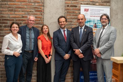De gauche à droite : Manon Louvet, responsable CNF-CEF, Santiago de Chile; Alain Carrier, doyen à la recherche (UBO); Virginie Delalande, directrice générale des affaires stratégiques (UBO); Saulo Neiva, directeur régional (AUF Amériques); Claudio Ruff, recteur (UBO); Gilles Mascle, responsable Bureau national Brésil et Amérique latine (AUF).