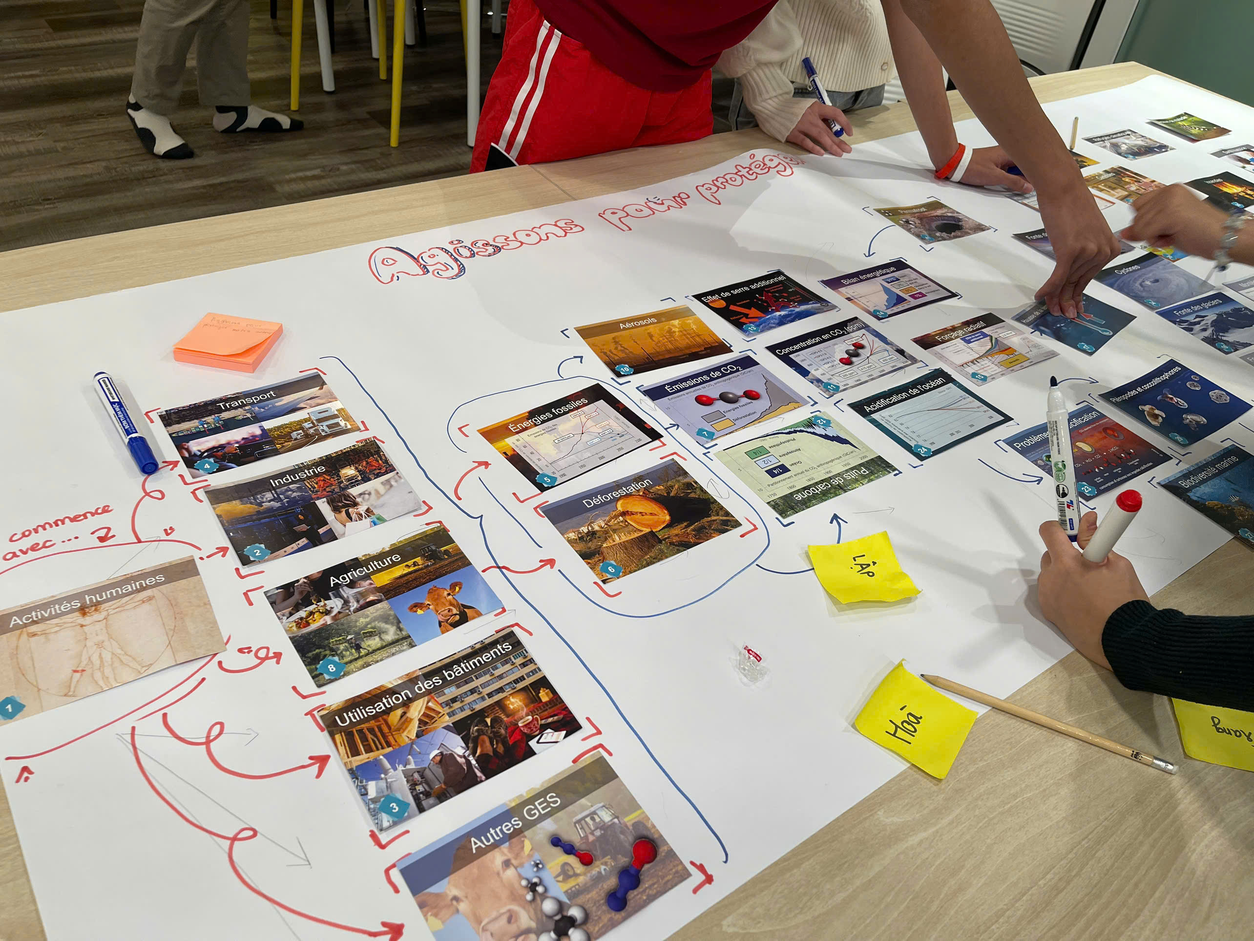 Chaque groupe de 6 à 8 personnes a participé activement à la création de sa propre « fresque », mettant en évidence les interactions complexes entre les causes et les effets du changement climatique.