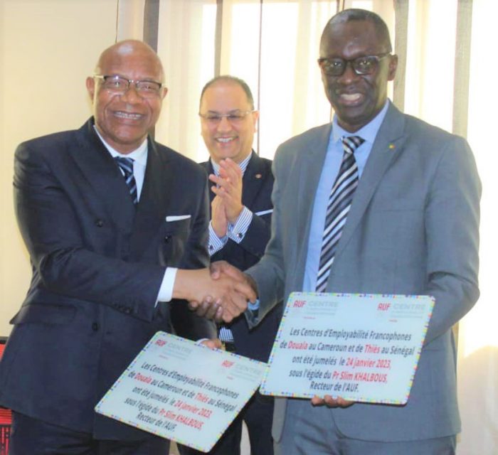 En marge de ce lancement du SNEE, une cérémonie de jumelage inédit entre le CEF de Thiès (Sénégal) et le CEF de Douala (Cameroun) a été organisée en présence du Recteur de l’AUF, du Recteur de Douala, le Prof. Magloire ONDOA du Directeur de l’ISEP-Thiès, le Prof. Fadel Niang, et des deux directrices régionales de l’AUF en Afrique de l’Ouest et en Afrique Centrale et Grands lacs. Deux Centres d’employabilité dédiés à leur ville avec la participation de l’ensemble des établissements membres de l’AUF à Thiès et Douala.