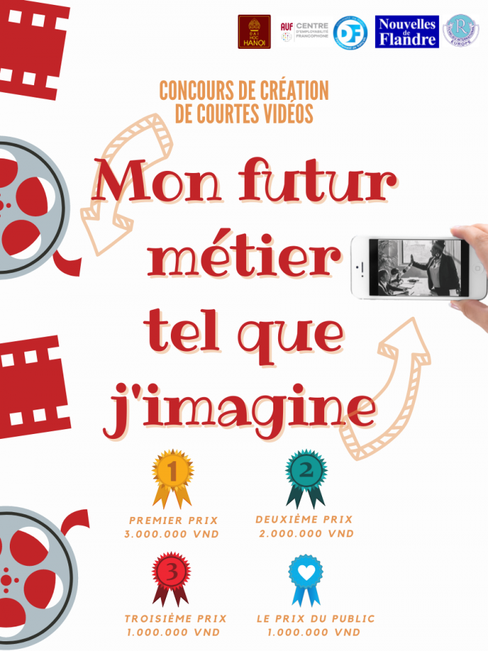 Le Département de français – Université de Hanoi, en collaboration avec le Centre d’Employabilité Francophone à Hanoi (CEF) de Hanoi, Nouvelles de Flandre et Richelieu International Europe, organise un concours de Création de courtes vidéos pour les étudiants parlant le français au Vietnam sur le thème « Mon futur métier tel que je l’imagine ». Ce concours est l’occasion pour les jeunes francophones et francophiles au Vietnam d’exprimer leurs souhaits et leurs imaginations sur leur avenir professionnel, et en même temps de libérer leur créativité, en utilisant des supports d’enregistrement vidéo et de montage vidéo professionnels et/ou amateurs.