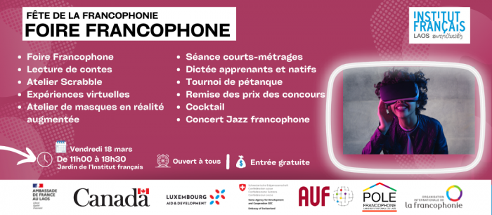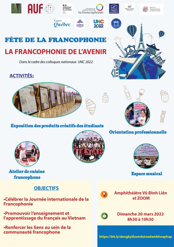 – Fête de la Francophonie « La Francophonie de l’avenir » organisée par l’Université de Langues et d’Etudes internationales (ULIS), l’Association des professeurs de français de Hanoï en collaboration avec l’Agence Universitaire de la Francophonie, l’Organisation internationale de la Francophonie et Institut Francophone International dans le but de promouvoir l’enseignement-apprentissage, la recherche du/en français et de valoriser les cultures francophones.