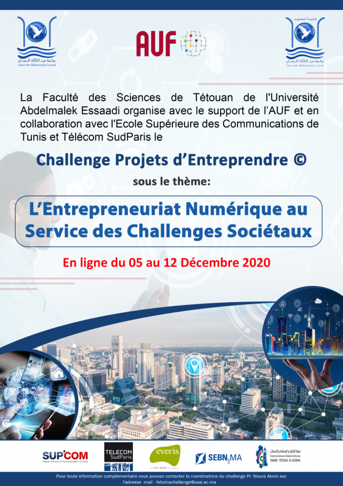 Dans le cadre du Projet « Formation Entrepreneuriale TUnisio-MAghrébine » (FETUMA) mené par l’AUF sur la région Maghreb, l'Université Abdelmalek Essâadi (UAE) de Tétouan a donné le coup d’envoi, le samedi 5 décembre 2020, au grand concours numérique « Challenge Projets d’Entreprendre © ». Il s’inscrit sous le thème de « L'Entrepreneuriat Numérique au service des challenges sociétaux ». Cette action vise à insuffler et à encourager l’esprit d’entrepreneuriat, d’innovation et de créativité auprès des étudiant.e.s. Il est organisé en ligne du 5 au 12 décembre en partenariat avec Télécom Sud Paris, SUP’COM Tunisie et plusieurs partenaires socio-économique.