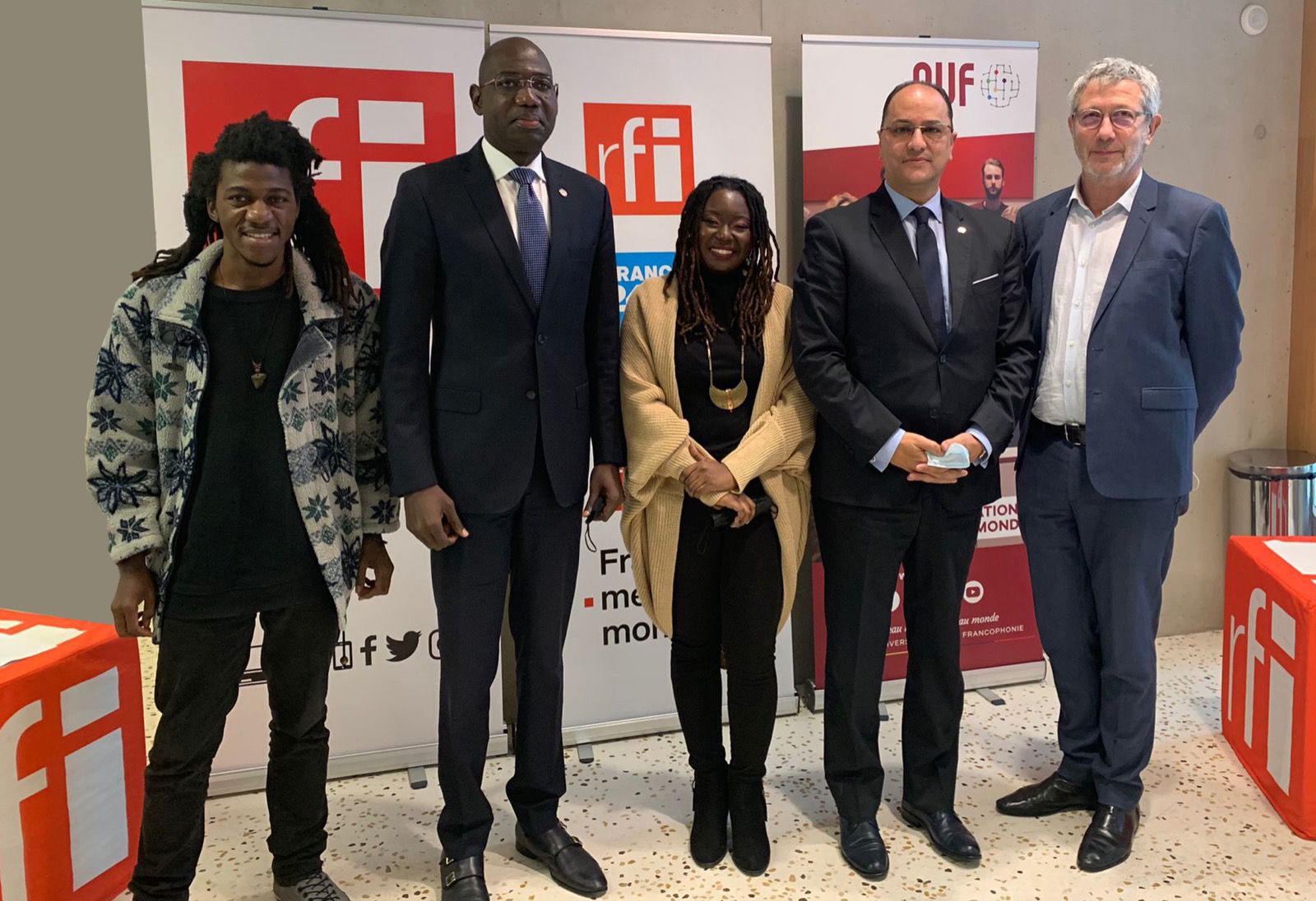 De gauche à droite : Jean D’Amérique, Poète, écrivain, slammeur ; Jean Josué Pierre Dahomey, Ambassadeur d’Haïti en France ; Pierrie-Ahn Fenelon, étudiante à l’Université Notre Dame d’Haïti, lauréate du Prix des Jeunes écritures RFI – AUF 2021 ; Prof. Slim Khalbous, Recteur de l’AUF ; Pascal Paradou, Adjoint à la directrice de RFI, chargé de la Francophonie et présentateur de l’émission « De Vive(s) voix ».