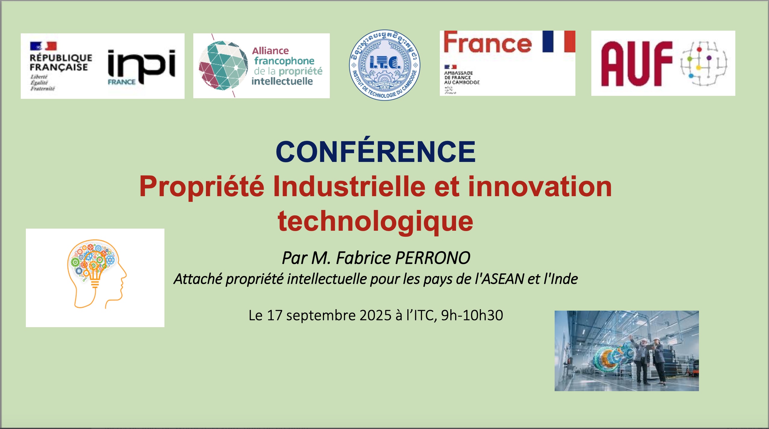 Deux conférences ont été successivement organisées les 16 et 17 septembre 2025 à Phnom Penh au Cambodge. La première s’intitule « Pourquoi est-il nécessaire de s’intéresser à la propriété intellectuelle (PI) dans sa démarche de développement au Cambodge ? » à l’Institut français du Cambodge (IFC) et la deuxième « Propriété industrielle et innovation technologique » à l’Institut de Technologie du Cambodge (ITC).