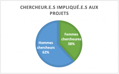 Les données permettent de constater qu’une plus grande proportion d’hommes que de femmes bénéficie du financement de PRISA. Parmi les personnes responsables des projets financés, 57 % sont des chercheurs et 43 % des chercheuses. Cet écart s’élargit lorsque l’on regarde l’ensemble des chercheuses et chercheurs impliqués aux projets : les hommes comptent alors pour 62 % tandis que les femmes ne représentent que 38 %.
