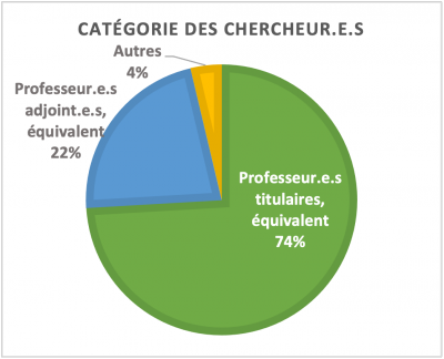 Nous constatons aussi que ce sont majoritairement des professeurs titulaires ou leur équivalent qui ont reçu du financement PRISA (74 %), tandis que les professeurs adjoints représentent un taux de 22 %.