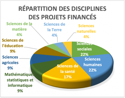 Les données montrent que de nombreuses disciplines sont financées dans le cadre des PRISA. Les projets sont principalement du domaine des sciences sociales (sciences juridiques, politiques, sociologie) et humaines (histoire, langue, aménagement du territoire), suivis de la santé.