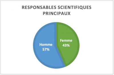 Les données permettent de constater qu’une plus grande proportion d’hommes que de femmes bénéficie du financement de PRISA. Parmi les personnes responsables des projets financés, 57 % sont des chercheurs et 43 % des chercheuses. Cet écart s’élargit lorsque l’on regarde l’ensemble des chercheuses et chercheurs impliqués aux projets : les hommes comptent alors pour 62 % tandis que les femmes ne représentent que 38 %.