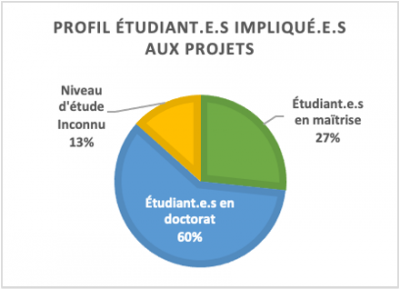 La tendance est cependant inversée en ce qui est des étudiant.e.s participant dans les projets. Les données montrent que les équipes comprennent une majorité d’étudiantes i(60 %) par rapport aux étudiants (40 %). Le profil des étudiant.e.s se répartit comme suit : doctorat (60 %), maîtrise (27 %), non précisé (13 %). La majorité de celles et ceux qui sont intégrés aux projets pour parfaire leur formation à la recherche ou pour effectuer un stage de recherche. D’autres ont contribué aux équipes projet en réalisant des tâches précises comme l’analyse de données, les traductions, l’organisation d’un colloque, etc.