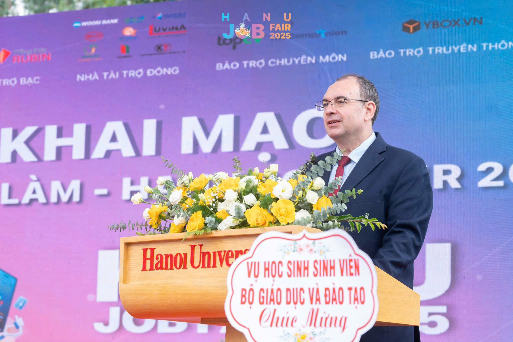 Dans son discours, le Prof. Nicolas Mainetti, Directeur régional de l’AUF – Asie-Pacifique, a présenté aux jeunes « FRASAP offre un espace unique d’échange, de collaboration, ainsi qu’un annuaire, une CVthèque, des offres d’emploi et un forum pour stimuler les opportunités académiques et professionnelles au sein de la francophonie en Asie-Pacifique. Je vous invite vivement à rejoindre ce réseau. C’est un outil précieux pour vous connecter, apprendre, et évoluer dans vos parcours professionnels. Un certain nombre d’offres d’emplois offertes par les entreprises présentes ont déjà été saisie sur la plateforme et j’invite tous les étudiants à compléter leur profil, mettre leur CV en ligne et consulter ces offres ».