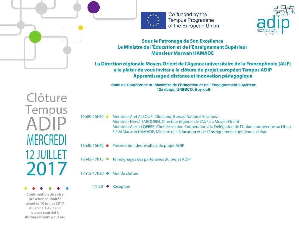 La cérémonie de clôture du projet Tempus "Apprentissage à distance et innovation pédagogique" (ADIP), financé par l'Union européenne, se tiendra le mercredi 12 juillet 2017 à 16h au Ministère libanais de l'Éducation et de l'Enseignement supérieur. Cette cérémonie, placée sous le haut parrainage de S.E.M. Marwan Hamadé, Ministre de l'Éducation et de l'Enseignement supérieur, sera l'occasion de présenter les résultats du projet et ses livrables. Cette cérémonie se déroulera en présence des partenaires libanais, égyptiens, français, belges et roumains du projet, ainsi que des représentants des milieux universitaire et professionnel.