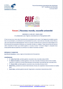 L'Agence universitaire de la Francophonie est fière partenaire de la 23e édition de la Conférence de Montréal - Forum économique international des Amériques. À cette occasion, l'AUF propose de discuter de la question de la place de l'université dans le développement contemporain et de la coopération inédite entre les grandes associations internationales d'universités.