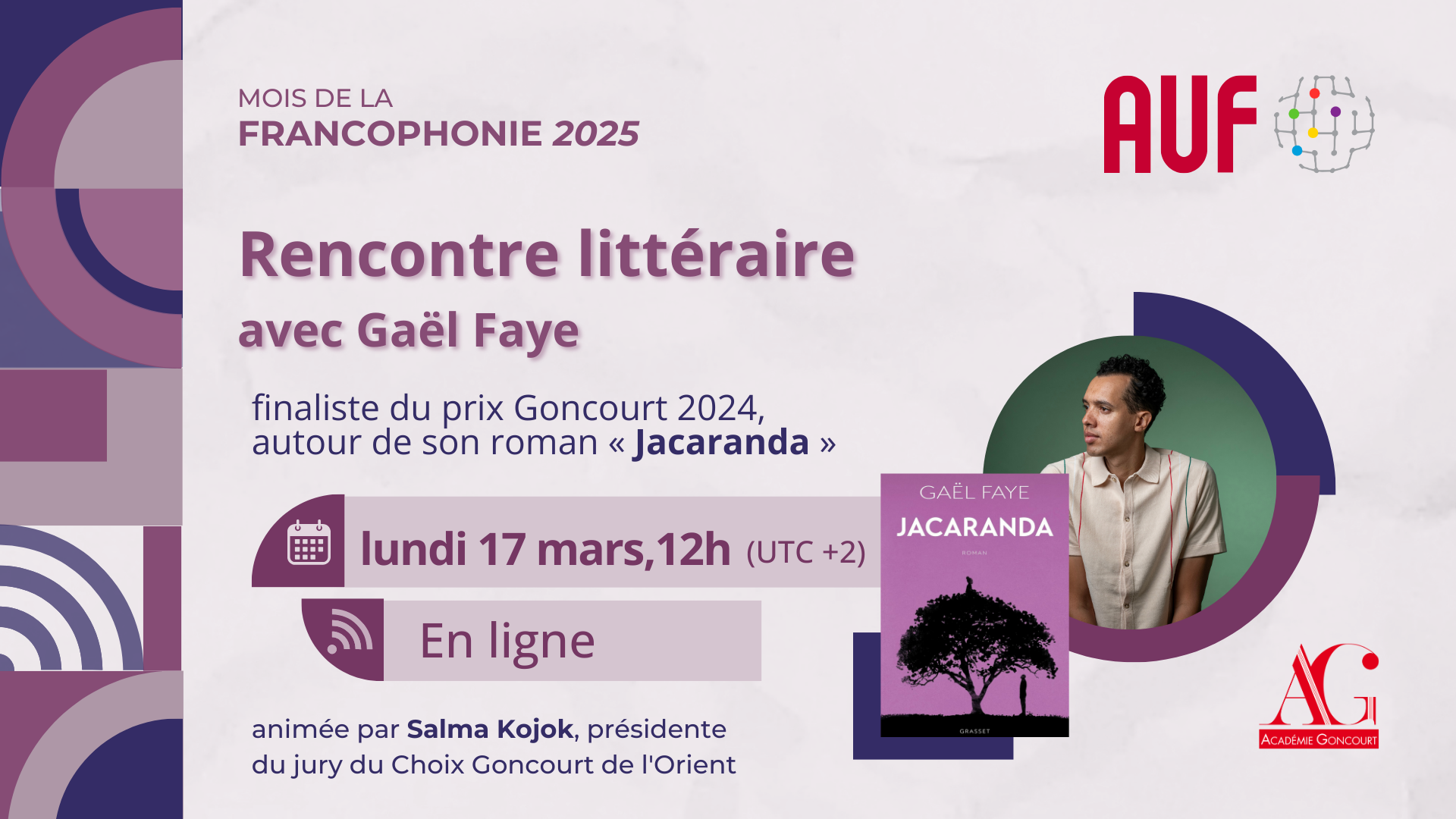 Dans le cadre du Mois de la Francophonie 2025, l’Agence Universitaire de la Francophonie au Moyen-Orient, en partenariat avec l’Académie Goncourt, organise une rencontre littéraire virtuelle avec Gaël Faye, écrivain, lauréat du Prix Renaudot, finaliste du prix Goncourt 2024. L’événement se tiendra en ligne le lundi 17 mars, à 12h heure du Liban (UTC+2), et sera animé par Salma Kojok, romancière et présidente du Jury du Choix Goncourt de l’Orient.