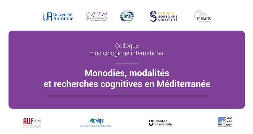 Le Centre de Recherche sur les Traditions Musicales de l’Université Antonine (Liban), l’International Musicological Society et Sorbonne Université-Institut de Recherche en Musicologie coorganisent un colloque musicologique international sous la thématique « Monodies, modalités et recherches cognitives en Méditerranée », du 2 au 4 novembre 2020, à l’Université Antonine au Liban, en mode à distance (en ligne). Ce colloque, de même que la publication d’articles qui en seront issus dans la Revue des traditions musicales, est réalisé avec le soutien de l'AUF Moyen-Orient.