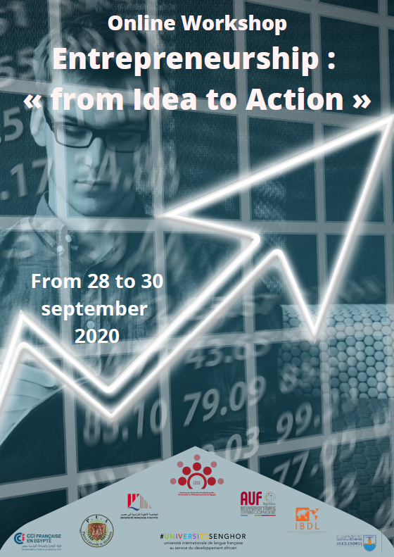 Dans le cadre du projet CIPIEE- Carrières et insertion professionnelle, innovation et entrepreneuriat en Égypte, la fondation IBDL « International Business Driving License» organise un atelier en ligne intitulé « Entrepreneurship from Idea to Action » (L'entrepreneuriat : de l'idée à l'action), les 28, 29 et 30 septembre 2020 de 10h00 à 13h30, heure d’Égypte.