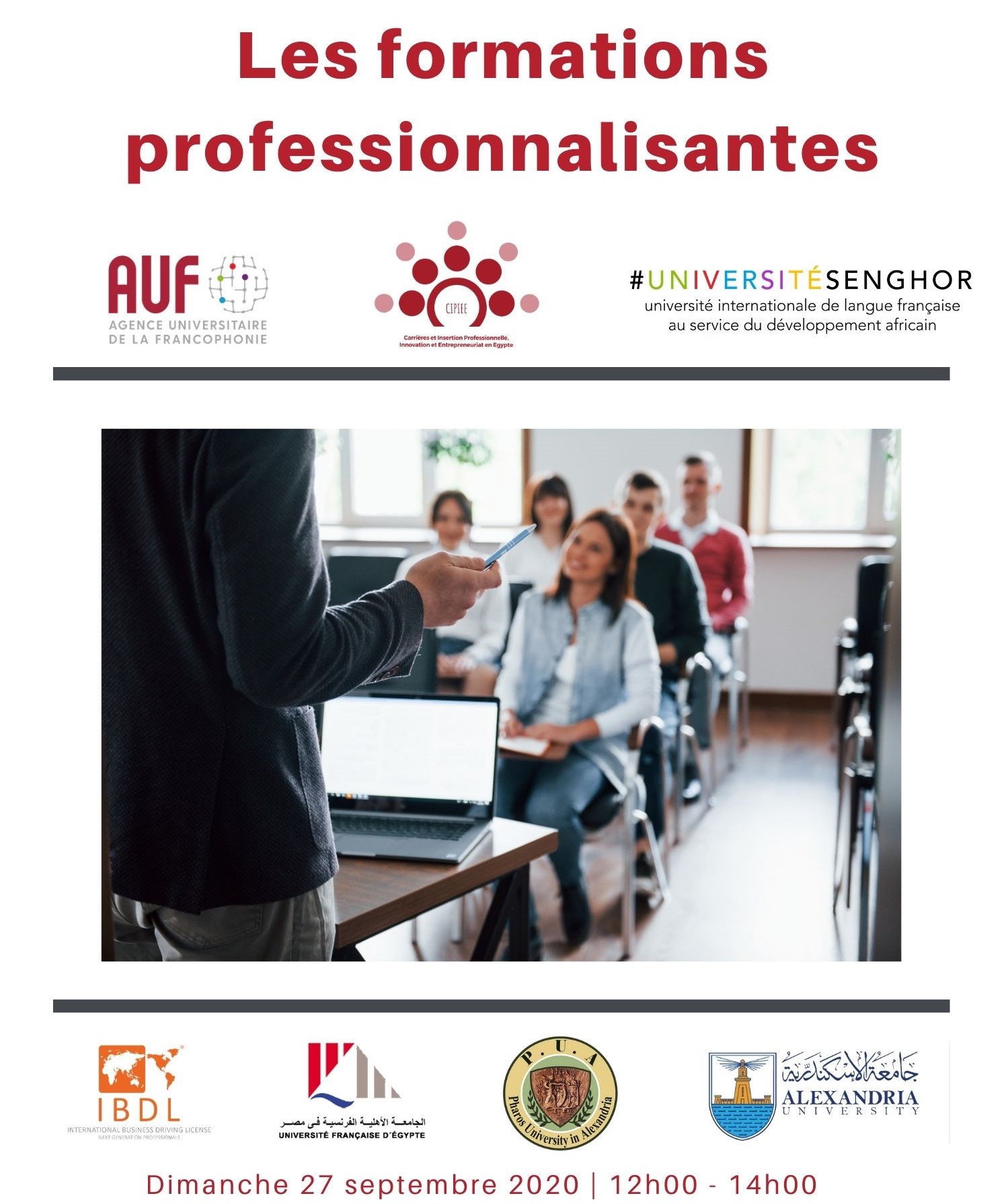 Dans le cadre du projet CIPIEE (Carrières et insertion professionnelle, innovation pédagogique et entrepreneuriat en Égypte), qui compte plusieurs partenaires (l'Agence universitaire de la Francophonie, l'université d'Alexandrie, l'Université Senghor, l'Université Française d’Égypte, l'Université Pharos, la fondation IBDL, et la Chambre de commerce et d'industrie française en Égypte), l'université d'Alexandrie organise une table ronde en ligne intitulée « les formations professionnalisantes » le dimanche 27 septembre 2020, de 12h00 à 14h00 (heure d’Égypte).