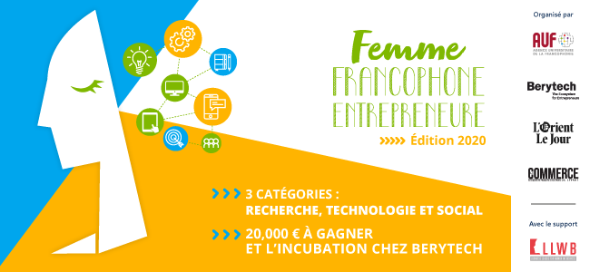 Pour la 9ème année consécutive, l’AUF, Berytech, L’Orient-Le Jour, et Le Commerce du Levant organisent la finale du concours « Femme Francophone Entrepreneure 2020 », le mardi 29 septembre 2020, de 14h à 17h, à Berytech, Mar Roukoz.