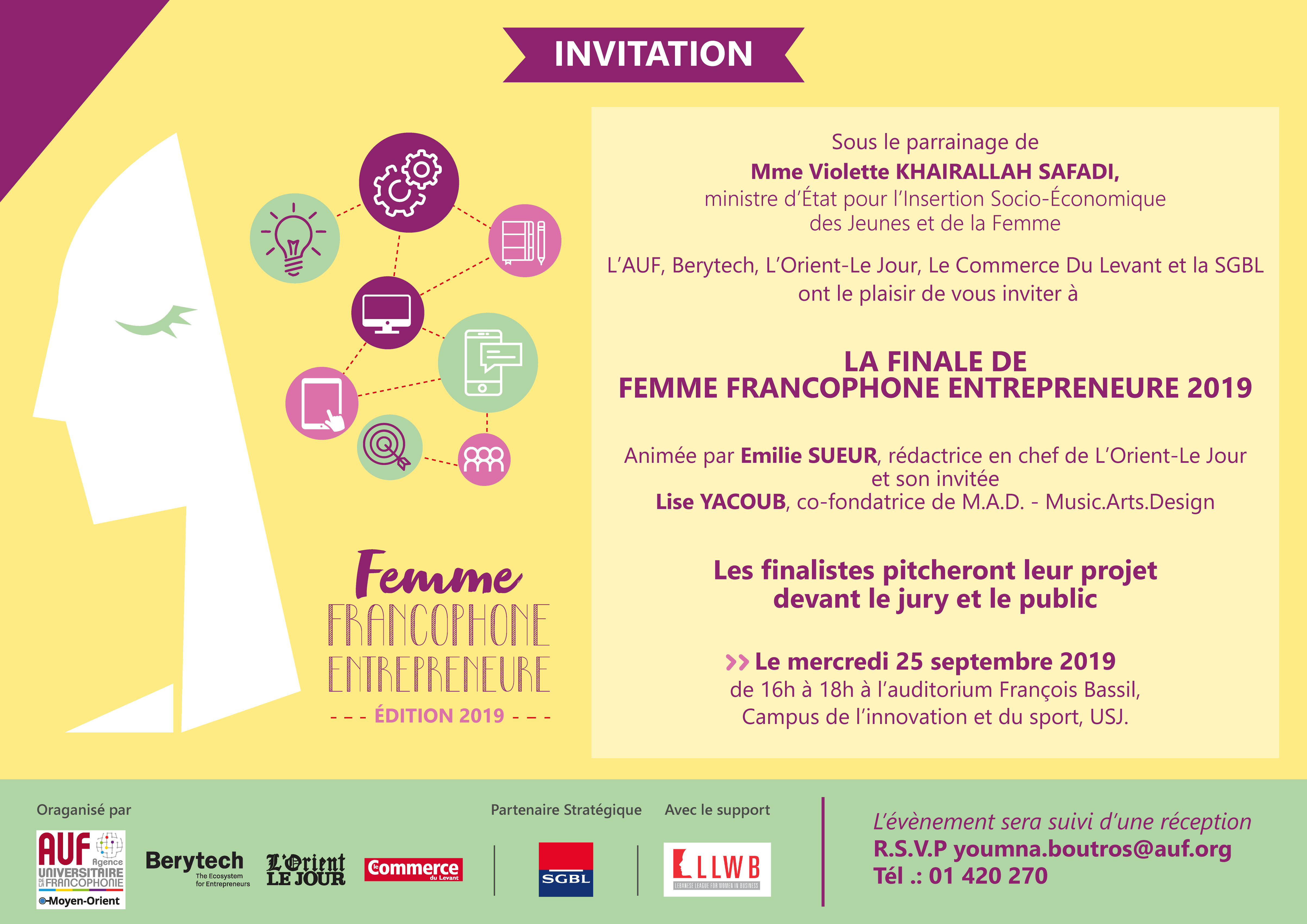 Sous le parrainage de Mme Violette Khairallah Safadi, ministre d’État pour l’insertion socio-économique des jeunes et de la femme, l’AUF, Berytech, L’Orient-Le Jour, Le Commerce du Levant et la SGBL organisent la finale du concours « Femme Francophone Entrepreneure 2019 », le mercredi 25 septembre 2019, de 16h à 18h, à l’auditorium François Bassil, Campus de l’innovation et du sport, Université Saint-Joseph.